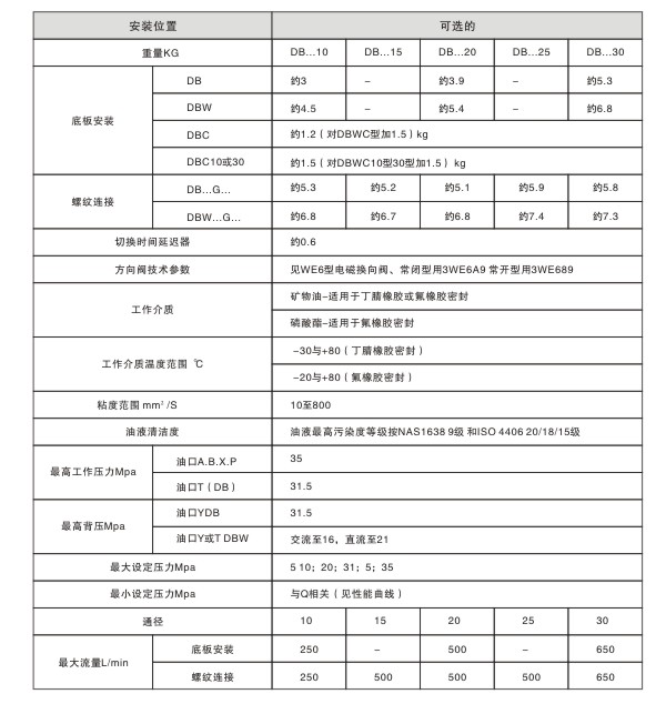 用于底板安裝,安裝面按DIN24340 E型,ISO 6264和CETOP-RP 121 H,用于螺紋連接,用于油路塊安裝。4種調(diào)整元件:①旋鈕②帶護(hù)罩的調(diào)節(jié)螺栓③帶刻度的有鎖旋鈕④帶刻度旋鈕。5種設(shè)定壓力,借助于安裝在其上的電磁方向閥操作卸荷。可選的切換時(shí)間延遲(僅DBW型)。